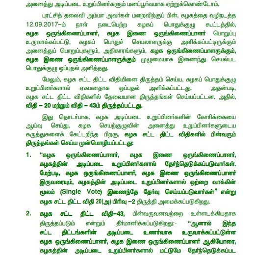 இதை 2017-ல் முதன்முதலாக மாற்றினர் எடப்பாடியும் பன்னீரும். தர்மயுத்தத்திற்குப் பிறகு இரு அணிகளும் ஒன்று சேர்ந்தபோது, அ.தி.மு.க-வின் பொதுச்செயலாளர் பதவியை கட்சி விதிகளிலிருந்து நீக்கிவிட்டு ஒருங்கிணைப்பாளர் மற்றும் இணை ஒருங்கிணைப்பாளர் என்ற கூட்டு அதிகாரம் கொண்ட பதவிகளைத் தோற்றுவித்தனர். இந்த ஒருங்கிணைப்பாளர் (ஓ.பன்னீர்செல்வம்) மற்றும் இணை ஒருங்கிணைப்பாளரை (எடப்பாடி பழனிசாமி) கட்சியின் பொதுக்குழு உறுப்பினர்களே தேர்வு செய்யலாம் என்றும் முடிவு செய்யப்பட்டது. அந்த விதிகளைத்தான் தற்போது மீண்டும் திருத்தியிருக்கிறது அ.தி.மு.க.