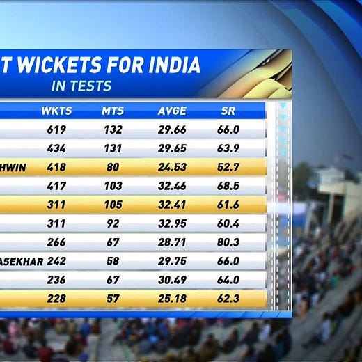 முதல் இரண்டு இடங்களில் அனில் கும்ளே (619) மற்றும் கபில் தேவ் (434) இருக்கின்றனர்.