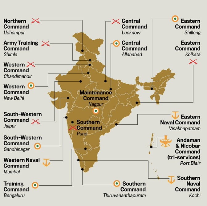 இந்தியாவில் முப்படைகளுக்கும் சேர்த்து மொத்தம் 17 தனித்தனி Command-கள் இருக்கின்றன. ஒரு Command என்பது ஒரு பிராந்தியத்தில் ராணுவ / கடற்படை / விமானப்படை சார்பில் செயல்படும் தளம். அதன்படி ராணுவத்திற்கும், விமானப்படைக்கும் 7 Command-களும், கடற்படைக்கு 3 Command-களும் இருக்கின்றன.