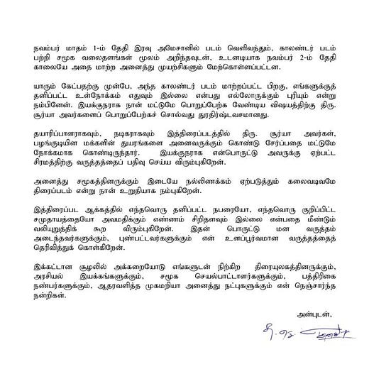 - இயக்குநராக என்பொருட்டு சூர்யாவுக்கு ஏற்பட்ட சிரமத்திற்கு வருத்தத்தைப் பதிவு செய்ய விரும்புகிறேன். ” எனக் குறிப்பிட்டிருக்கிறார்.
