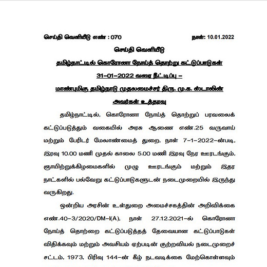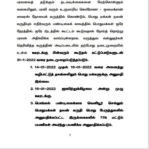 - 16/01/2022 அன்று (காணும் பொங்கல்) முழு ஊரடங்கு.