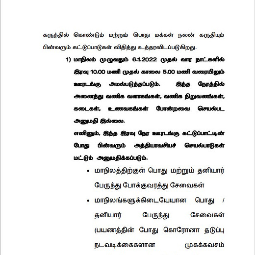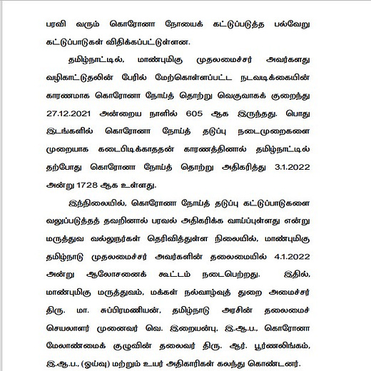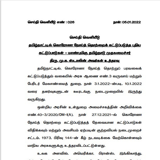 ஓமிக்ரான் பரவல் அதிகரிப்பதைத் தொடர்ந்து, தமிழக அரசு இன்று முதல் புதிய கட்டுப்பாடுகளை விதித்திருக்கிறது. அவற்றில் முக்கியமான 5-ஐ மட்டும் இங்கே குறிப்பிடுகிறேன்…
