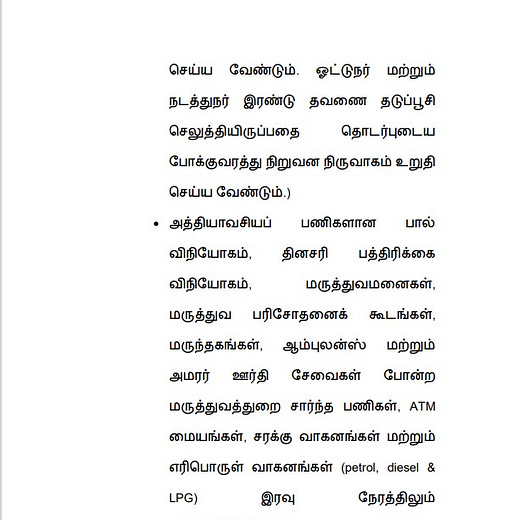 - வார நாள்களில், இரவு 10 மணி முதல் காலை 5 மணி வரை தமிழகம் முழுவதும் இரவு நேர ஊரடங்கு அமலுக்கு வருகிறது. இந்த நேரத்தில் அத்தியாவசிய சேவைகள் தவிர்த்து, வேறு எதற்கும் அனுமதியில்லை. உள்மாநில / வெளிமாநில பேருந்துகள் வழக்கம்போல இயங்கும்.
