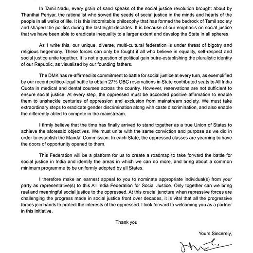 நாடு முழுவதும் சமூகநீதி மற்றும் கூட்டாட்சி தத்துவம் தொடர்பான முன்னெடுப்புகளை மேற்கொள்ளும் வகையில், `அகில இந்திய சமூகநீதிக் கூட்டமைப்பு’ என ஒரு அமைப்பு ஏற்படுத்தப்படும் எனக் குடியரசு தினத்தன்று அறிவித்திருந்தார் தமிழக முதல்வர் மு.க.ஸ்டாலின்.