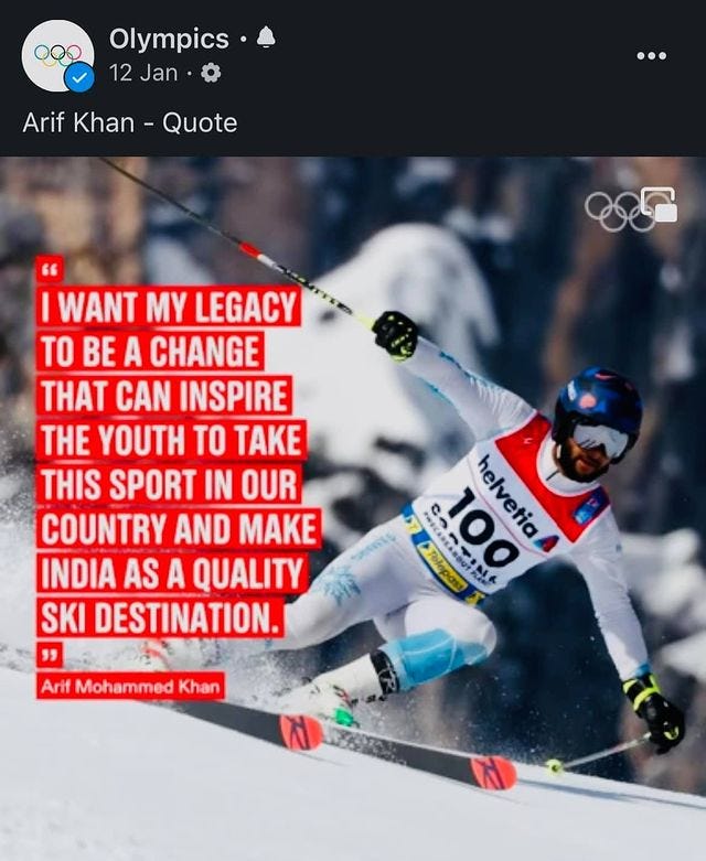 இந்தியா சார்பாக இந்த ஒலிம்பிக்கில் ஒரே ஒரு வீரர் மட்டுமே கலந்துகொள்கிறார். அவர் காஷ்மீர் மாநிலத்தைச் சேர்ந்த 31 வயது பனிச்சறுக்கு வீரரான ஆரிஃப் கான்.